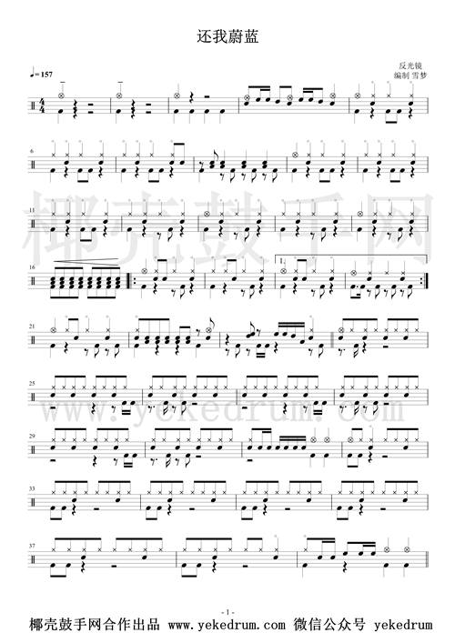 本站分享还我蔚蓝架子鼓谱仅为第一页普通清晰版获取还我蔚蓝高清完整版鼓谱可