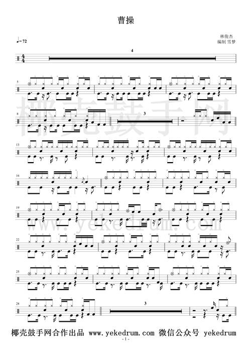 本站分享曹操架子鼓谱仅为第一页普通清晰版获取曹操高清完整版鼓谱可