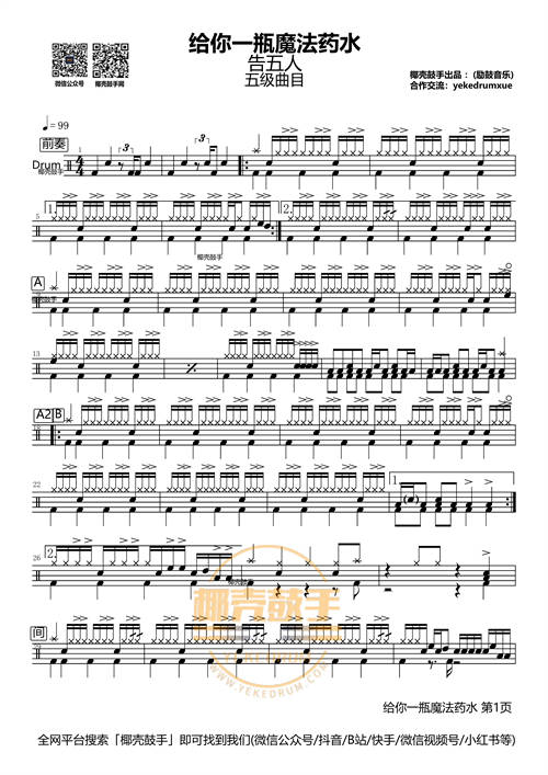 关注【椰壳鼓手】公众号,添加客服微信咨询获取告五人歌曲给你一瓶魔法药水完整高清打印版鼓谱