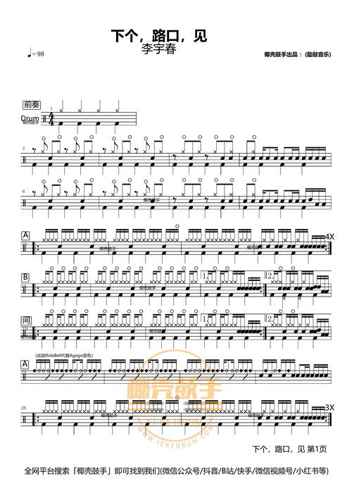 本站分享下个,路口,见架子鼓谱仅为第一页普通清晰版获取下个,路口,见高清完整版鼓谱可