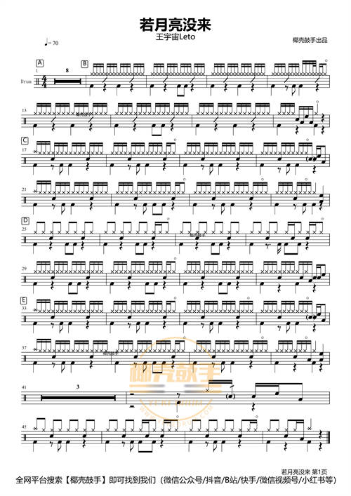 关注【椰壳鼓手】公众号,添加客服微信咨询获取王宇宙Leto歌曲若月亮没来完整高清打印版鼓谱