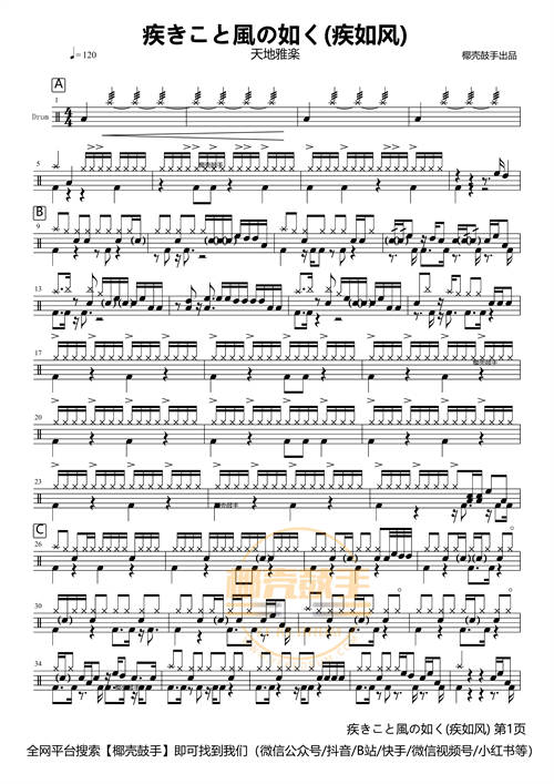 关注【椰壳鼓手】公众号,添加客服微信咨询获取天地雅楽歌曲疾如风(疾きこと風の如く)完整高清打印版鼓谱